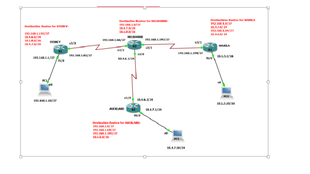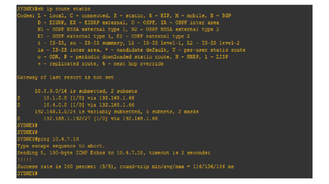On this post, the two subnets 10.4.6.0/24 and 10.4.7.0/24 were summarized into a single entry of 10.4.0.0/16. As seen, the two network address were IP segments located on Auckland routers. For the simplicity, I have just change the configuration of SYDNEY router’s static routing.