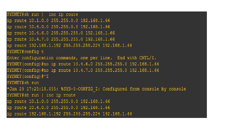 On this post, the two subnets 10.4.6.0/24 and 10.4.7.0/24 were summarized into a single entry of 10.4.0.0/16. As seen, the two network address were IP segments located on Auckland routers. For the simplicity, I have just change the configuration of SYDNEY router’s static routing.