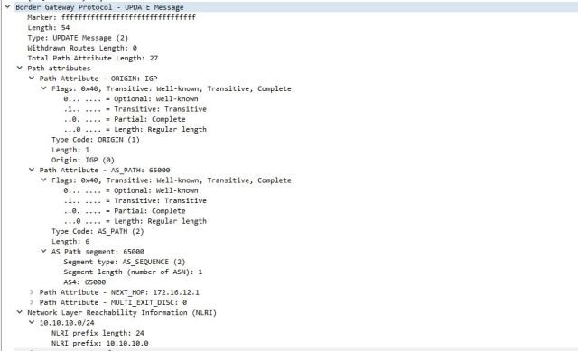 5. The Update Message means that’s the BGP neighbors have started exchanging routing information. From the Wireshark results, we can see the information such as Widrawn routes, Total Path Attribute Length, Path Attributes, NLRI details…