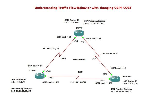 4. Change the OSPF cost on SYDNEY link towards MANILA to 1000 and check the traffic flow from MANILA towards SYDNEY router loopback 2. Questions to ask here, is the IBGP peering between SYDNEY and MANILA resetted? Is MANILA sending the advertisement via SYDNEY after SYDNEY link is costed out?