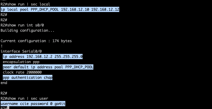 Again on R2, I have the the IP Pool that will be assigned on R1. PPP authentication is enabled and I have the username and password that will be used by R1 for the CHAP handshake initiated by R2.