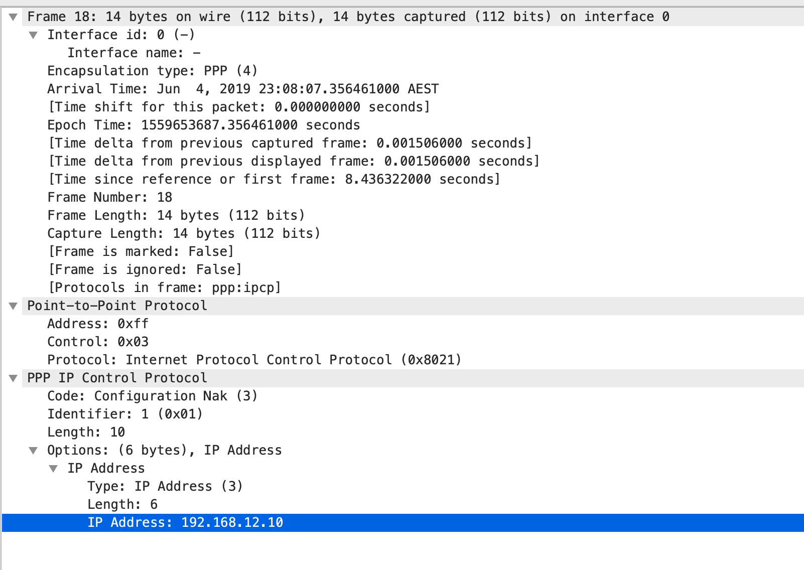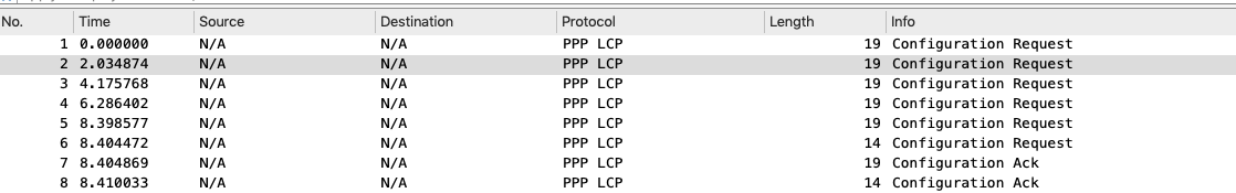 As seen below, both R1 and R2 is exchanging Configuration details. As we know from the configurations, we have assigned an IP address on R2’s serial interface but we have not assigned any to R1 serial port. There was response below from R2 – Configuration-NAK ( or Configuration Negative-Acknowledgment) in which R2 is proposing a new IP to R1 from the IP pool set up on R2.