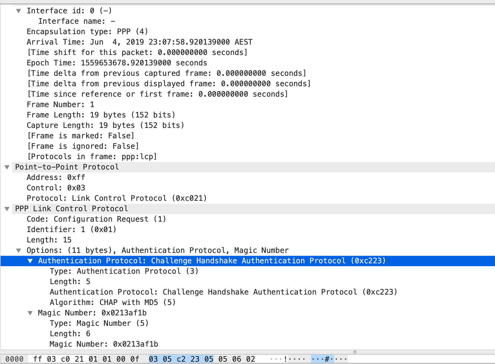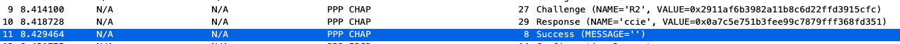2. R1 received a CHAP challenge from R2. The way how this works is that R2 is sending a CHAP challenge with R1. R2 is generating a random MD5 hashing value which includes the local router authentications and this MD5 value is sent out to R1. In response, R1 have created with own version of hashing value which includes details of the existing authentication configured and this is sent out towards R2. R2 will then check the CHAP response and when it decode that R1 is using the same authentication, it will send out a SUCCESS Message to R1, thus both of them are now friends. 🙂