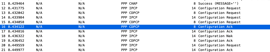 Meanwhile, R1 will also send IPCP and CDPCP Configuration Request to R2. It is interesting to note here that R1 will provide details that its has no IP address,