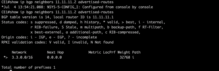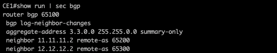 And PE1 is also receiving the same prefixes. Now let me add and aggregate summary for the prefixes on CE1: