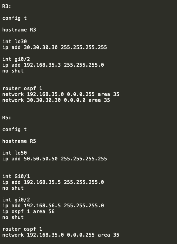 As observed above, the coorect areas were assigned , example for R5 which is the middle router has both areas facing R3 as area 35 and facing R6 as area 56…